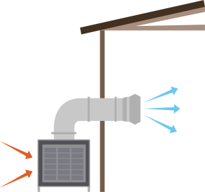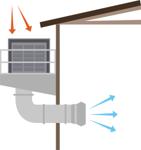 En el caso de los equipos evaporativos fijos es necesario realizar una instalación. En función de las características de tu espacio, los elementos estarán dispuestos en una posición u otra. Si, por ejemplo, el evaporativo se coloca en el techo de la nave, los conductos se posicionarán en vertical. En cambio, si el evaporativo se coloca en la pared, se posicionarán en un lateral, como puedes observar en la foto.